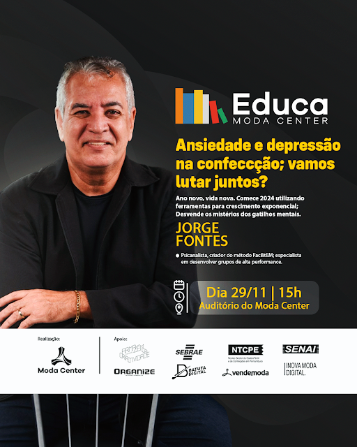 Na próxima quarta-feira, 29 de novembro, o psicanalista e escritor Jorge Fontes comandará a 27ª edição do Educa Moda Center como a palestra “Ansiedade e depressão nas confecções; vamos lutar juntos?”.